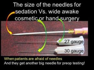 Office based procedures are actually less painful than procedures performed in the operating room. Remember, the 20 G IV needle that is placed before hospital surgery is much larger than the small 27 or 30 G needle used to begin local anesthesia in the office. In addition, there are no veins to try and find as local anesthesia is administered without the need for venous access. Finally, there is no need for painful lab draws prior to surgery, as preoperative testing is not even necessary.